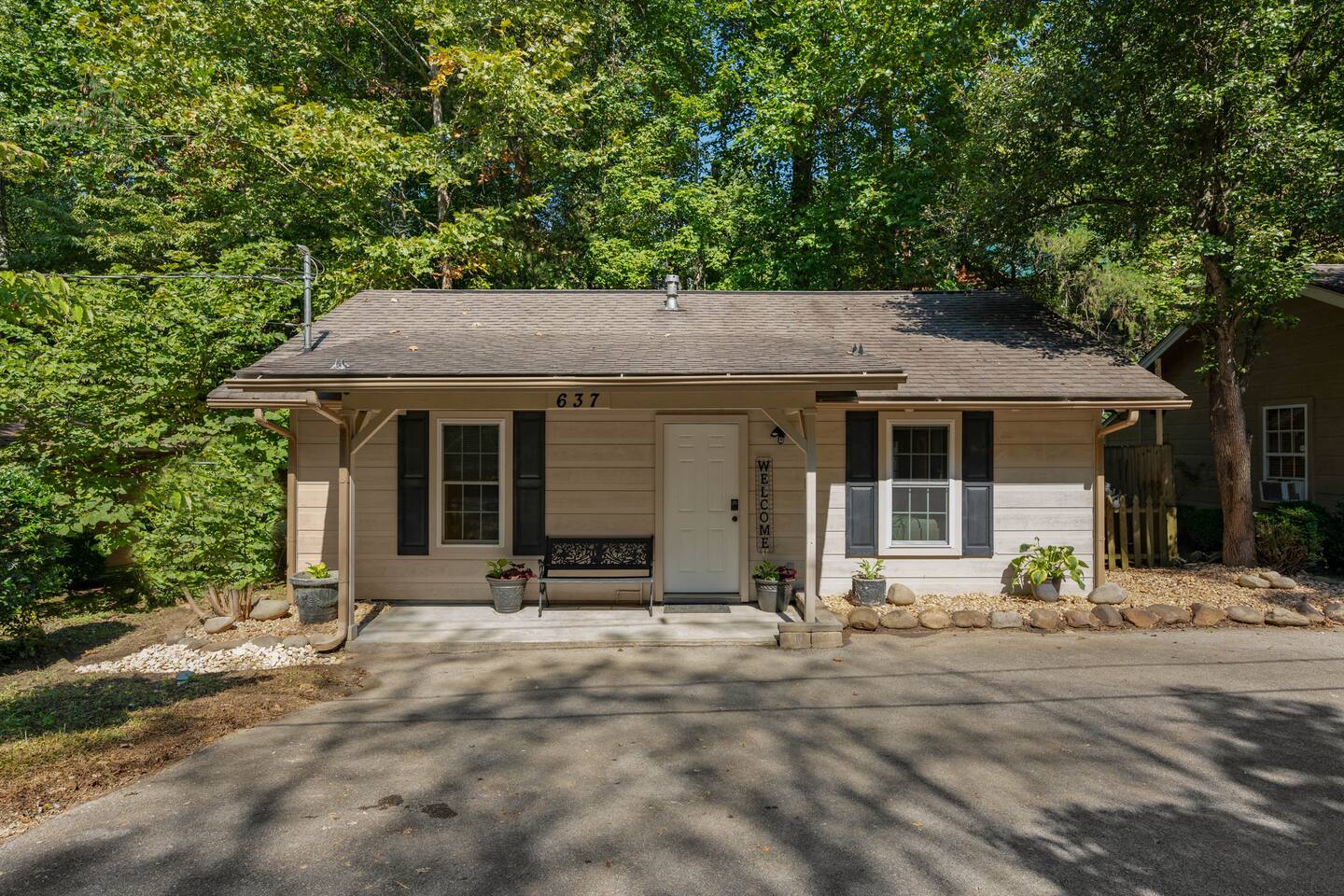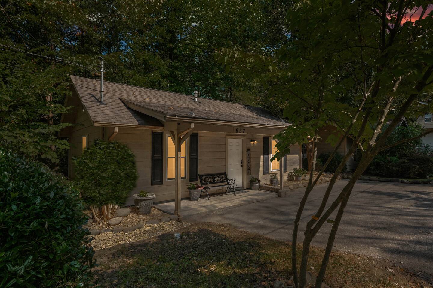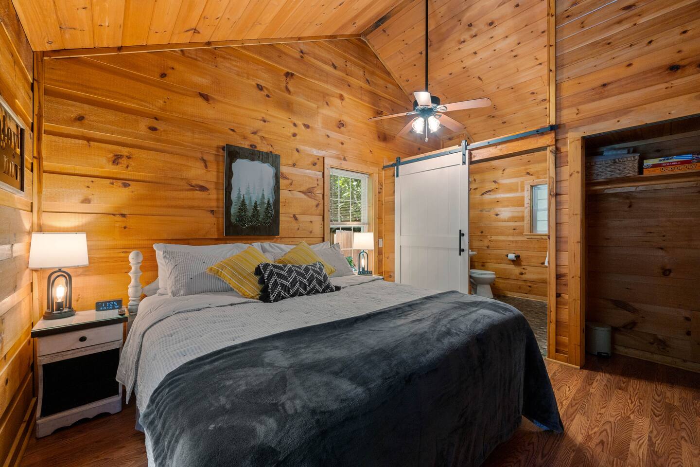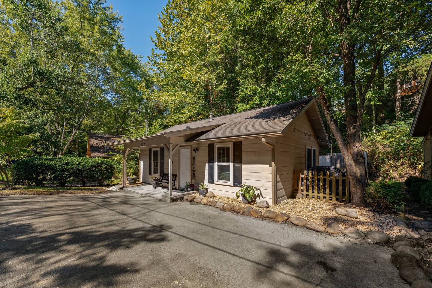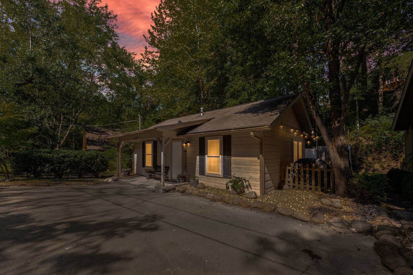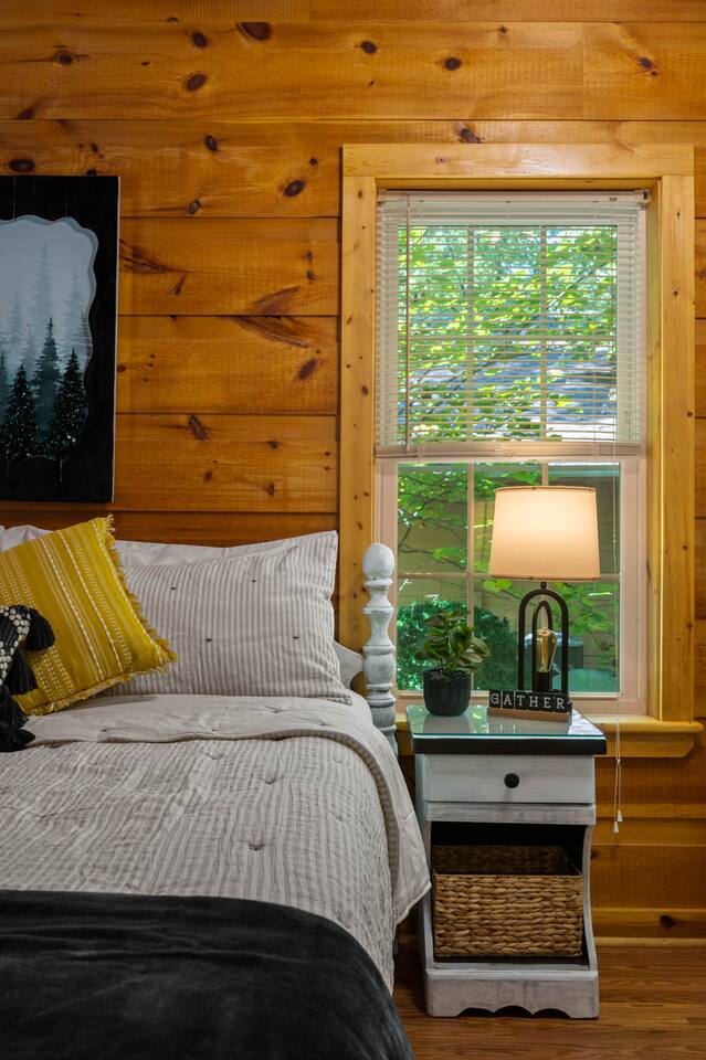 Experience true Smoky Mountain charm at this cozy cabin tucked away in the heart of Gatlinburg’s beloved Arts & Crafts Community. Surrounded by towering trees and just minutes from downtown, this centrally located hideaway offers the best of both worlds—peaceful seclusion with easy access to local shops, restaurants, and outdoor adventures. Whether you're planning a romantic getaway or a small family retreat, this cabin has everything you need for a memorable stay. After a day of exploring the Great Smoky Mountains National Park, strolling through downtown, or discovering handmade treasures in the local artisan shops, come home to unwind in your private backyard oasis. Soak in the hot tub under the stars, fire up the grill, and kick back beneath twinkling string lights while taking in the mountain air. Inside, the cabin welcomes you with warm wood accents, vaulted ceilings, and an open-concept layout. Curl up by the stone fireplace, stream your favorite shows on the smart TV, or play a board game while enjoying that cozy, cabin-in-the-woods feel. The kitchen is fully stocked with essentials and the dining area offers seating for four—perfect for a homecooked meal after a long day of mountain adventures. The spacious bedroom features a luxurious king-size bed, ceiling fan, smart TV, and touches of local artwork for a true Smoky Mountain touch. The en-suite bathroom includes a relaxing jetted tub, stand-alone shower, and a brand-new sliding barn door for a little rustic charm. Other conveniences include in-unit washer and dryer, high-speed Wi-Fi, and thoughtful touches throughout to make your stay as relaxing as possible Whether you’re here to hike, shop, relax, or take in the magic of the Smokies—this Gatlinburg gem is ready to welcome you!
