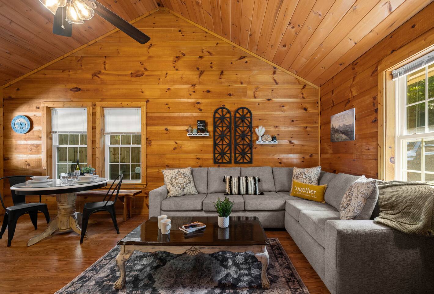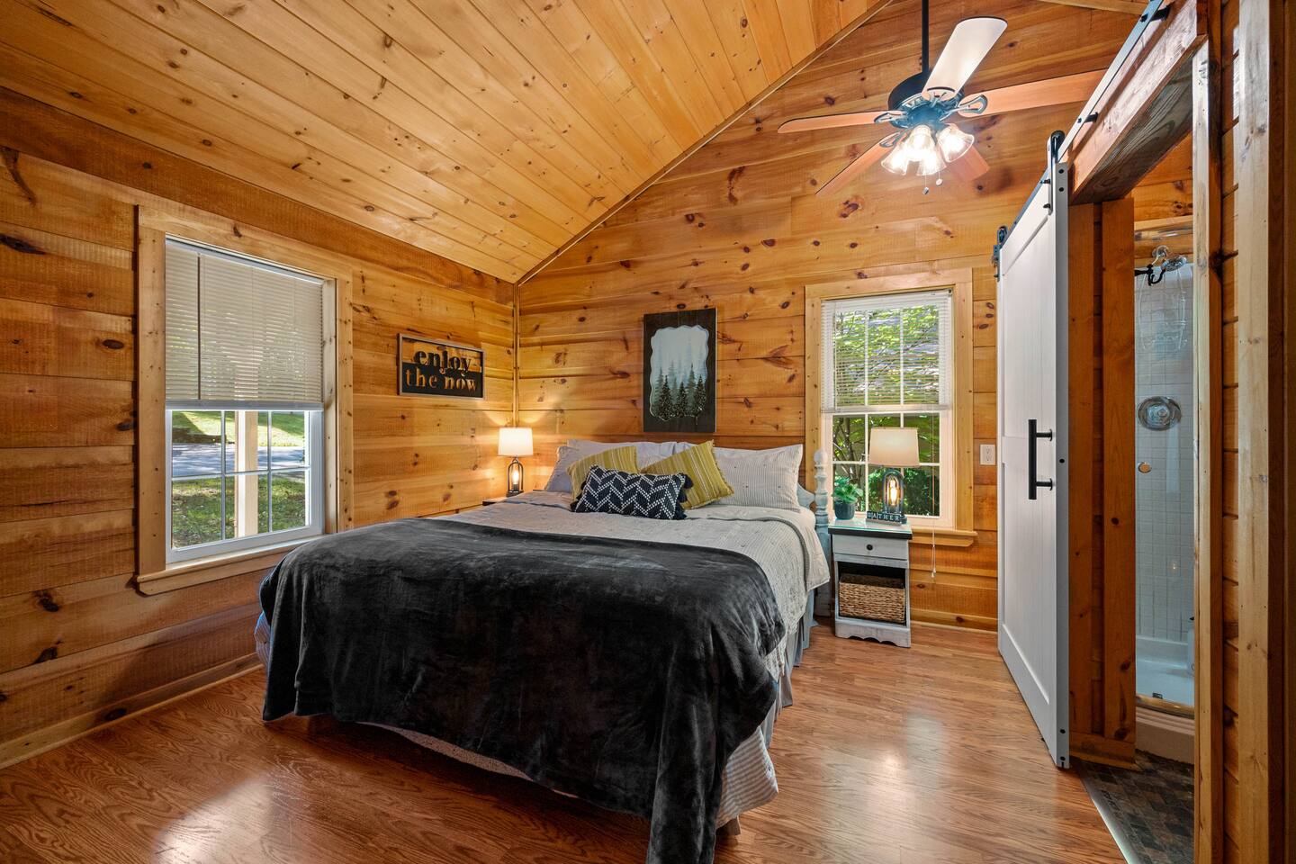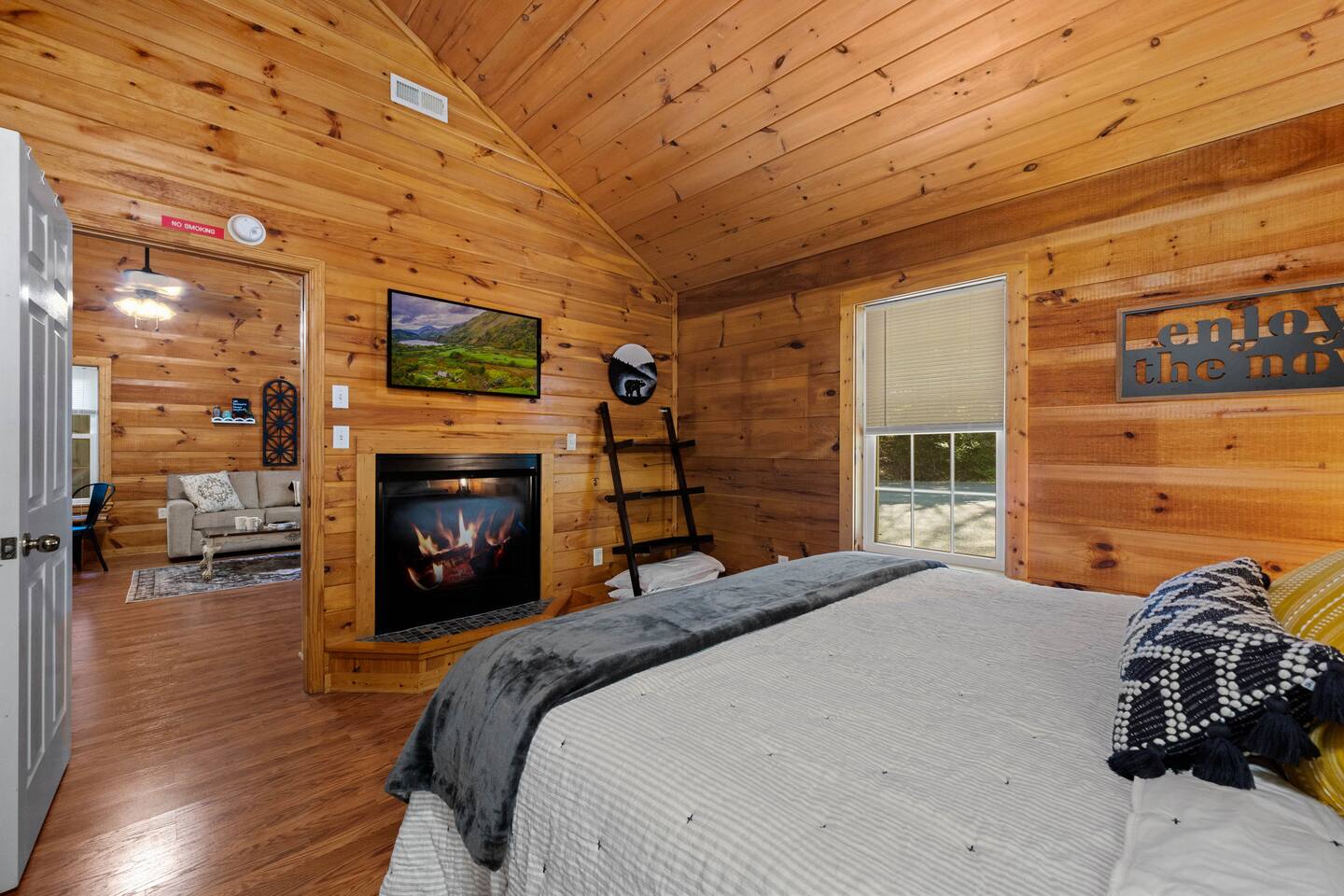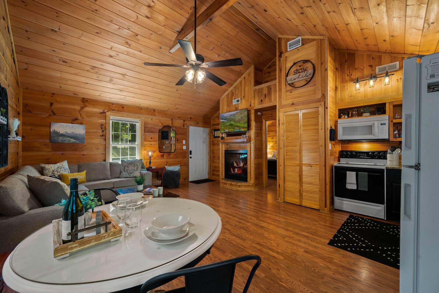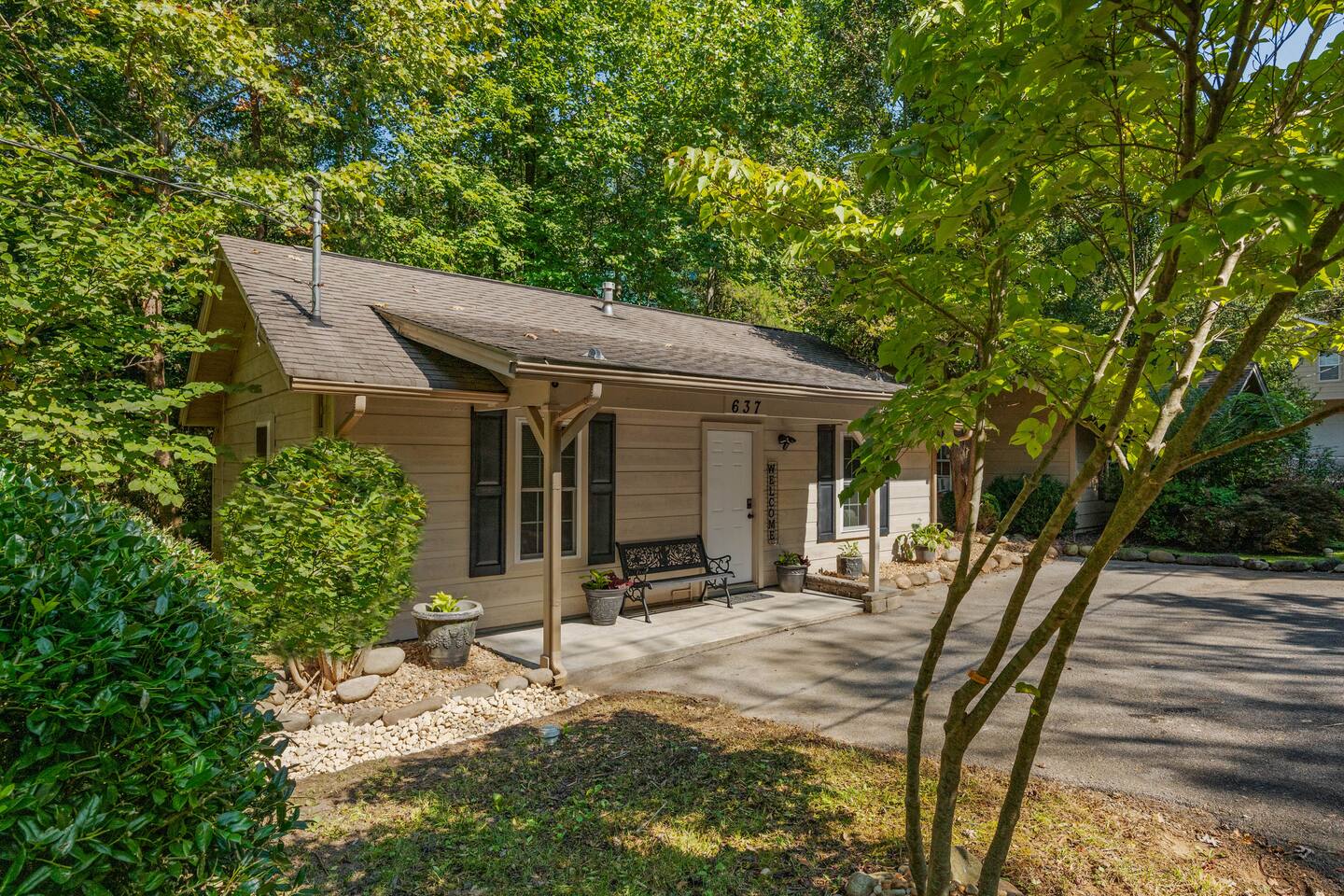 Experience true Smoky Mountain charm at this cozy cabin tucked away in the heart of Gatlinburg’s beloved Arts & Crafts Community. Surrounded by towering trees and just minutes from downtown, this centrally located hideaway offers the best of both worlds—peaceful seclusion with easy access to local shops, restaurants, and outdoor adventures. Whether you're planning a romantic getaway or a small family retreat, this cabin has everything you need for a memorable stay. After a day of exploring the Great Smoky Mountains National Park, strolling through downtown, or discovering handmade treasures in the local artisan shops, come home to unwind in your private backyard oasis. Soak in the hot tub under the stars, fire up the grill, and kick back beneath twinkling string lights while taking in the mountain air. Inside, the cabin welcomes you with warm wood accents, vaulted ceilings, and an open-concept layout. Curl up by the stone fireplace, stream your favorite shows on the smart TV, or play a board game while enjoying that cozy, cabin-in-the-woods feel. The kitchen is fully stocked with essentials and the dining area offers seating for four—perfect for a homecooked meal after a long day of mountain adventures. The spacious bedroom features a luxurious king-size bed, ceiling fan, smart TV, and touches of local artwork for a true Smoky Mountain touch. The en-suite bathroom includes a relaxing jetted tub, stand-alone shower, and a brand-new sliding barn door for a little rustic charm. Other conveniences include in-unit washer and dryer, high-speed Wi-Fi, and thoughtful touches throughout to make your stay as relaxing as possible Whether you’re here to hike, shop, relax, or take in the magic of the Smokies—this Gatlinburg gem is ready to welcome you!