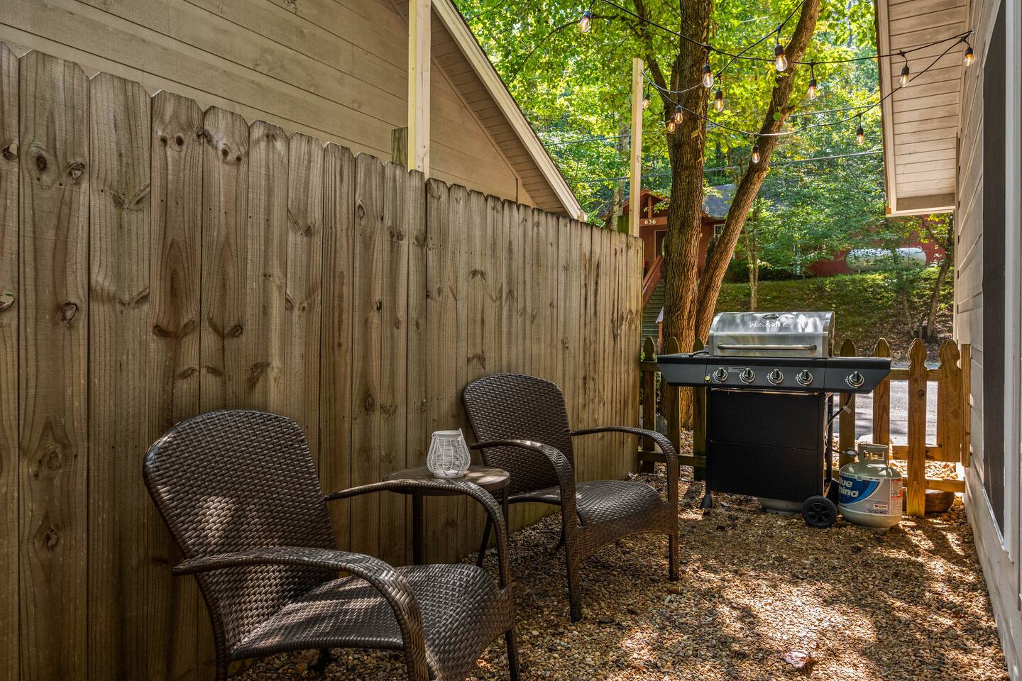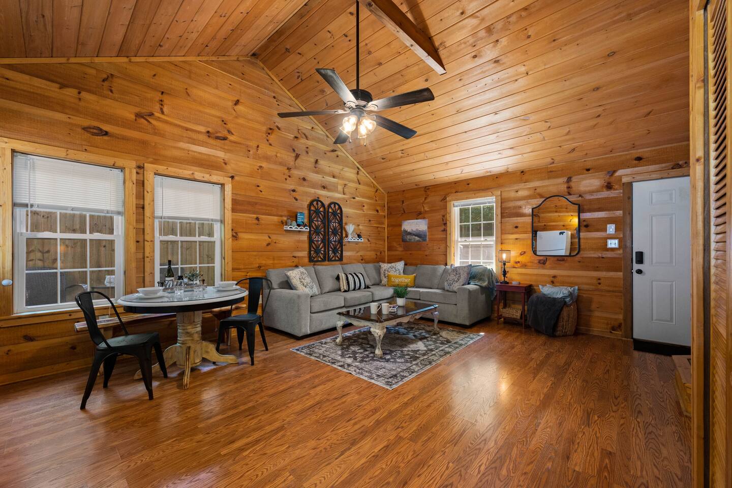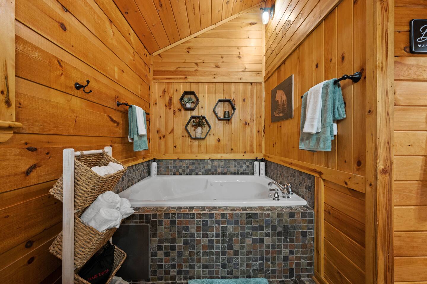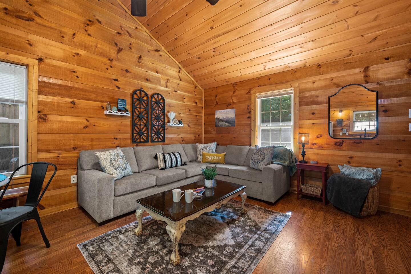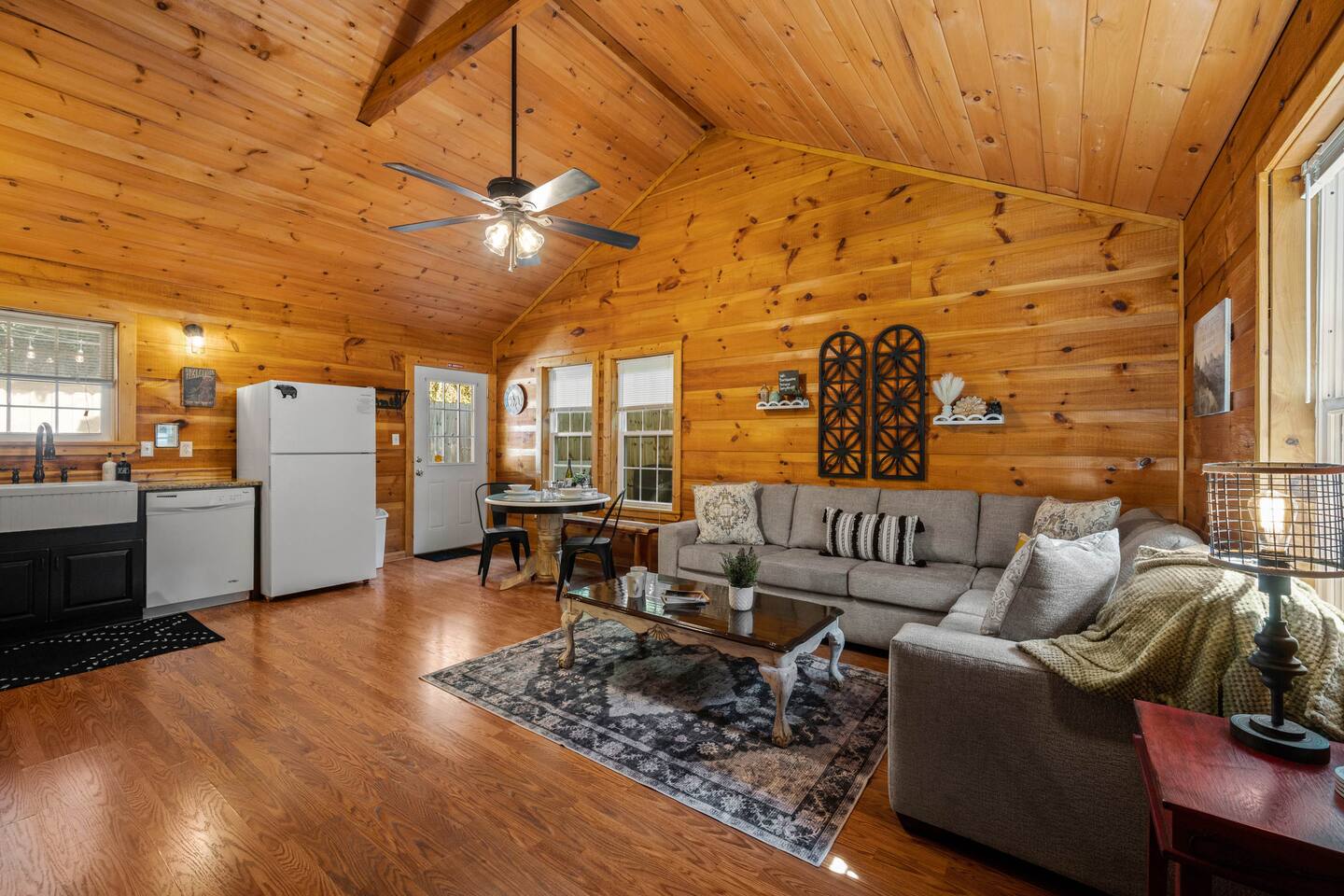 Experience true Smoky Mountain charm at this cozy cabin tucked away in the heart of Gatlinburg’s beloved Arts & Crafts Community. Surrounded by towering trees and just minutes from downtown, this centrally located hideaway offers the best of both worlds—peaceful seclusion with easy access to local shops, restaurants, and outdoor adventures. Whether you're planning a romantic getaway or a small family retreat, this cabin has everything you need for a memorable stay. After a day of exploring the Great Smoky Mountains National Park, strolling through downtown, or discovering handmade treasures in the local artisan shops, come home to unwind in your private backyard oasis. Soak in the hot tub under the stars, fire up the grill, and kick back beneath twinkling string lights while taking in the mountain air. Inside, the cabin welcomes you with warm wood accents, vaulted ceilings, and an open-concept layout. Curl up by the stone fireplace, stream your favorite shows on the smart TV, or play a board game while enjoying that cozy, cabin-in-the-woods feel. The kitchen is fully stocked with essentials and the dining area offers seating for four—perfect for a homecooked meal after a long day of mountain adventures. The spacious bedroom features a luxurious king-size bed, ceiling fan, smart TV, and touches of local artwork for a true Smoky Mountain touch. The en-suite bathroom includes a relaxing jetted tub, stand-alone shower, and a brand-new sliding barn door for a little rustic charm. Other conveniences include in-unit washer and dryer, high-speed Wi-Fi, and thoughtful touches throughout to make your stay as relaxing as possible Whether you’re here to hike, shop, relax, or take in the magic of the Smokies—this Gatlinburg gem is ready to welcome you!
