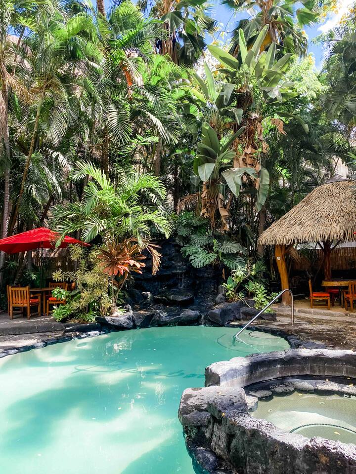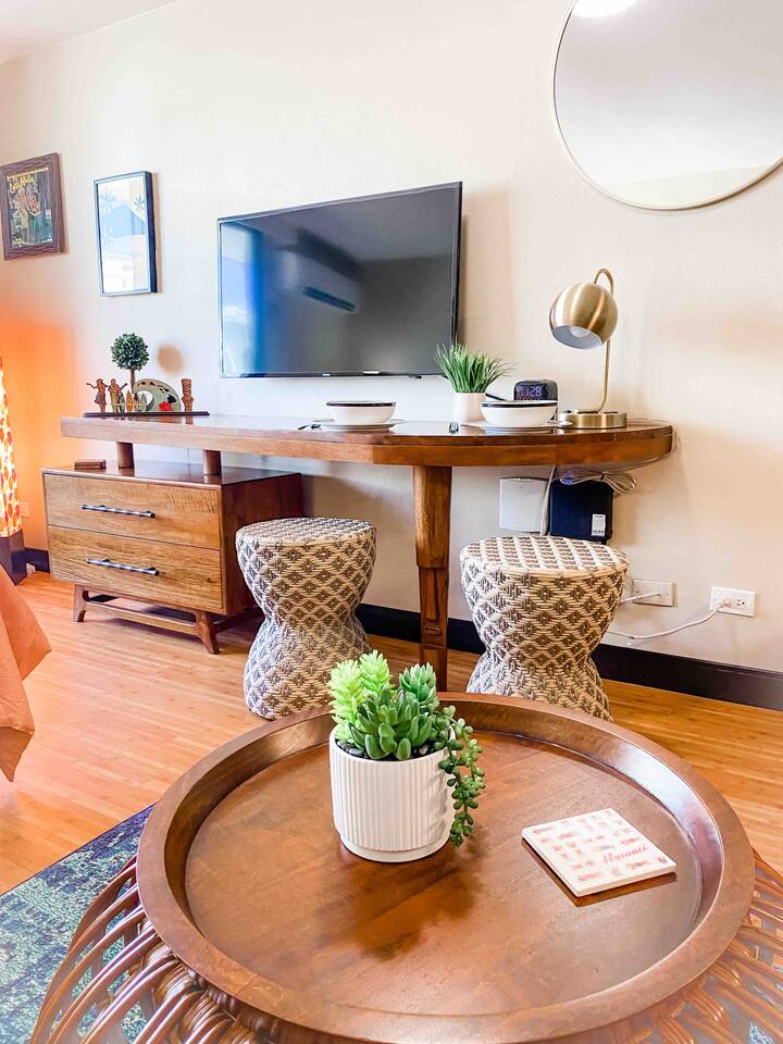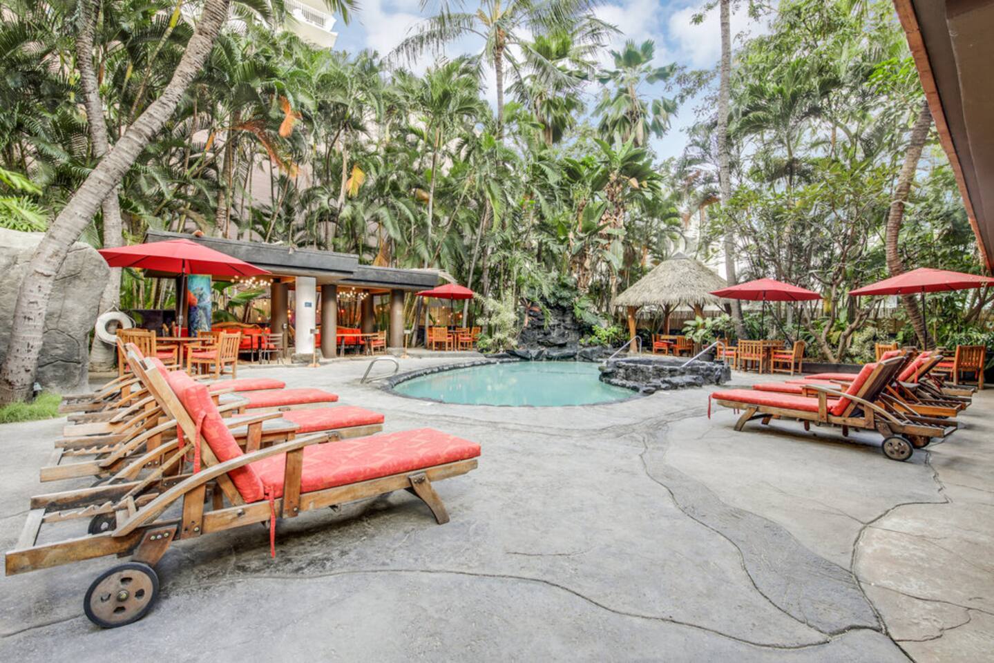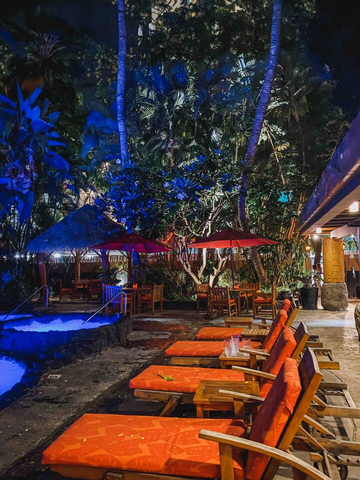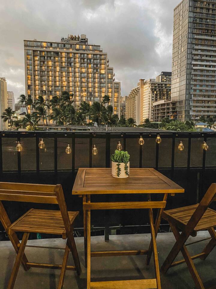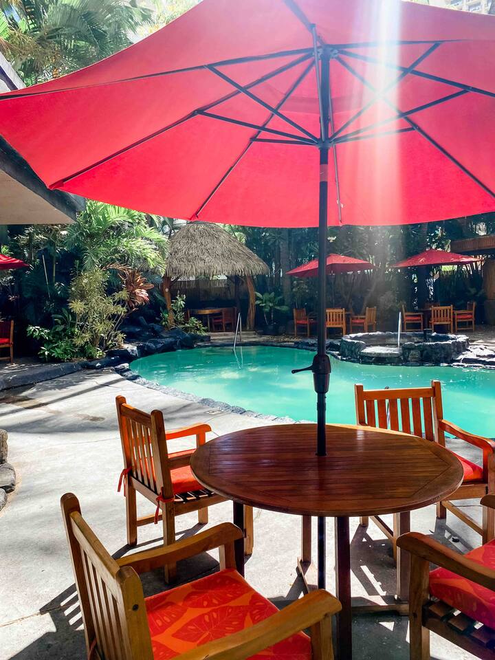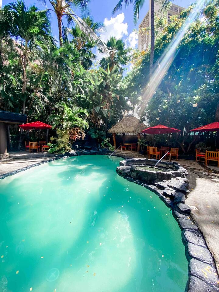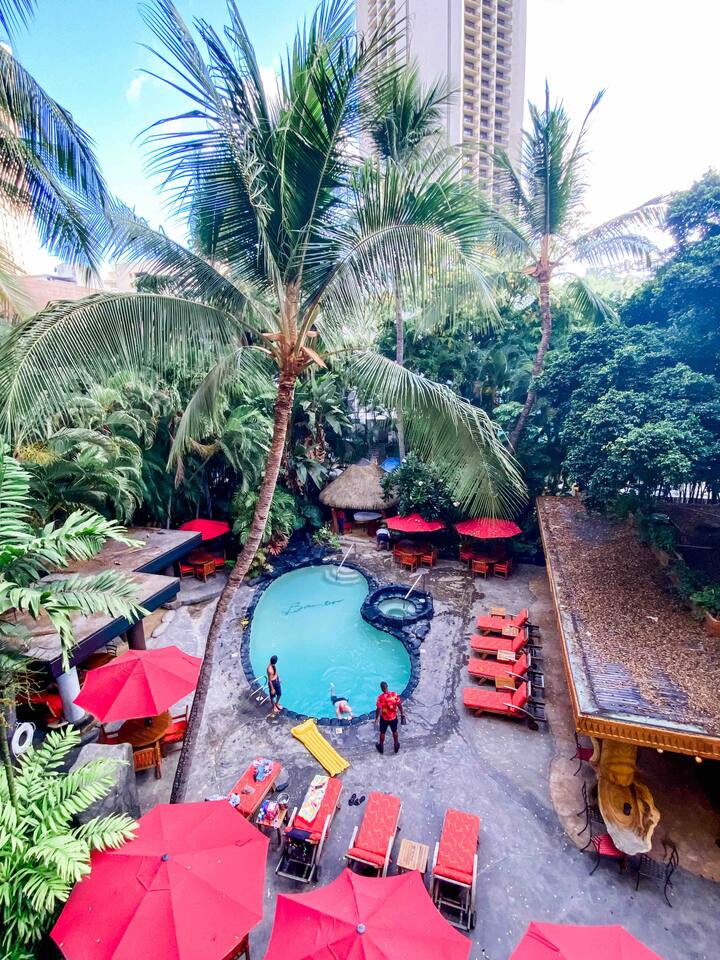 ✔ To easily re-access this listing or make sharing with your group easier, add this listing to your wishlist by clicking the <3 in the upper-right corner. This boutique condo is just 1½ blocks to the pristine sands of Waikiki Beach! Newly renovated studio with a fully equipped kitchenette, and city views from the private lanai. The ideal location and beach themed decor make this vacation retreat one you don't want to miss. Enjoy the restaurant downstairs, next to the tropical tiki themed pool and hot tub! Mere steps to beachfront shops, restaurants, and a quick walk to the iconic Waikiki beach with crystal clear waters! You will enjoy new central AC, Free WiFi, flat screen tv, dual burner top, coffee pot, air-fryer, toaster, microwave, cooking essentials, beach towels, and more. Walking distance to Kalakaua Ave shops, Waikiki beach, Honolulu Zoo, and Diamond Head Mountain. This condo is a fun hideaway adorned with Tiki theme décor. Charming island esthetic surrounds the condo immersing you in a unique Hawaiian experience. Lush tropical trees surround the private outdoor pool, jacuzzi, and waterfall restaurant area. Use the bbq on-site, near the pool, or explore all the surrounding options for dining, shopping and outdoor activities. Located on Kūhiō Ave, mere steps from the International Market Place. On-site Parking is available with the building. Available for an additional $35/day, and is first come first serve.