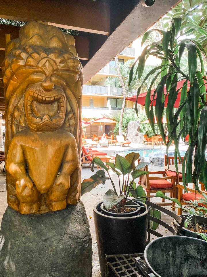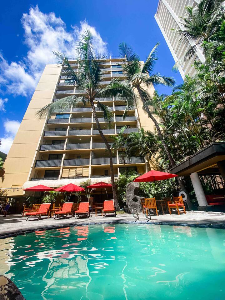 ✔ 1.5 Blocks to the Beach front ✔ Located on Kuhio Ave. surrounded by shops + restaurants ✔ Pool + Hot Tub + Ko Tiki Terrace Restaurant in the Condo ✔ New AC ✔ Fully outfitted Kitchenette ✔ Free Fast Wifi ✔ Flat Screen TV with Cable TV ✔ Queen Bed ✔ Beach Towels ✔ On site parking (paid)